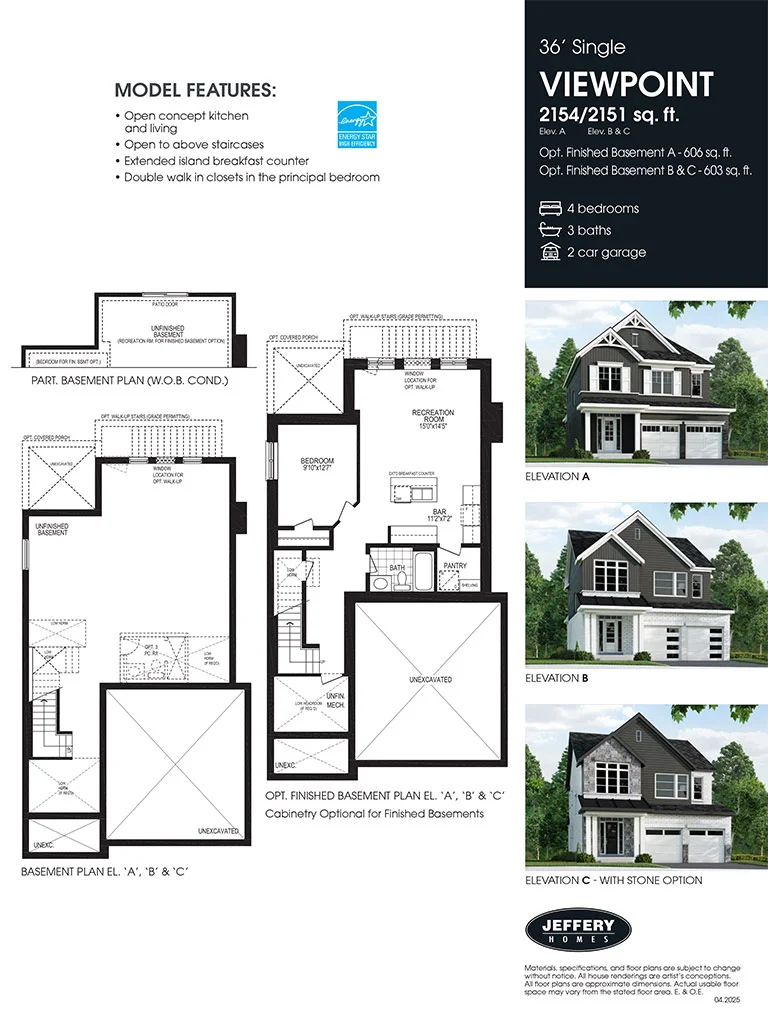 The Viewpoint model features an open concept kitchen and living area, with an open-to-above staircase and an extended breakfast island. The large principal bedroom with double walk-in closets allows for more overall, uncluttered living space. Its ensuite has double sinks, a freestanding tub and a glass shower… giving you much needed “me space” in your busy home.